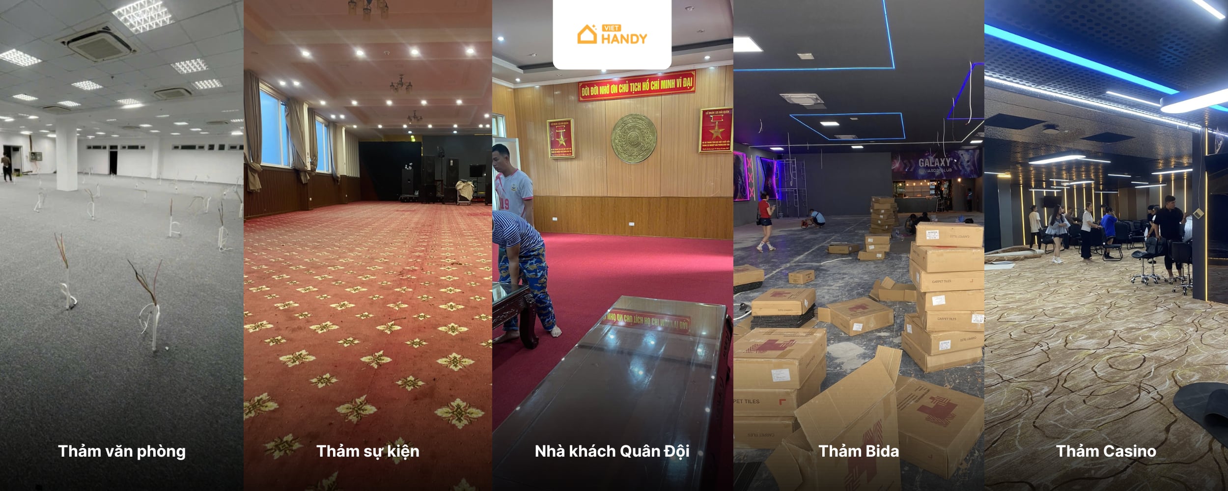Sau khi đã kiểm tra đầy đủ mặt bằng, thống nhất đơn giá, chủng loại thảm trải sàn văn phòng và ngày thi công. Đến lịch thi công, đội ngũ thi công của Viet Handy sẽ có mặt tại công trình, tập kết vật tư thảm sàn và chuẩn bị mặt bằng trước khi thi công cho văn phòng.